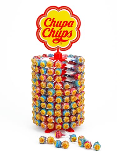 「チュッパチャプス ホイールディスプレイ」は、円形の回転台にチュッパチャプスがずらりと刺さったディスプレイ型のセットです。海外では店舗用の販促什器としてよく見かけますが、最近では家庭用として購入する人も増えているようです。代表的なタイプは200本入りで、定番のコーラ味やストロベリークリーム、チェリー、オレンジなど、人気のフレーバーがミックスされています。360度どこから見てもキャンディが並ぶ姿はとにかく華やかで、インテリアとしても存在感があります!