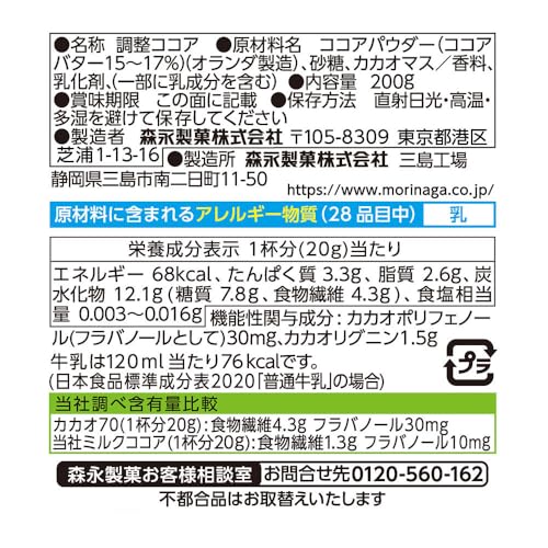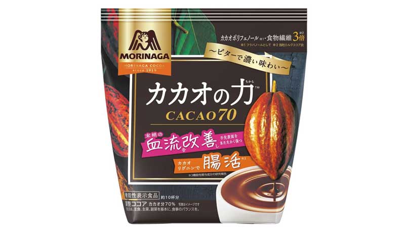 森永製菓の「カカオの力 CACAO70」は、カカオ分70%のハイカカオココアとして人気を集めている、少し大人向けのココアパウダーです。機能性表示食品として「末梢の血流を改善し、手先の表面温度を保つ」「腸内環境の改善に役立つ」といった働きが報告されており、単なる甘いココアではなく、体の内側から整えたい人にも嬉しいアイテム。カカオ由来のポリフェノールや食物繊維が豊富で、1杯分(20g)で食物繊維をしっかり摂れるのも魅力です。